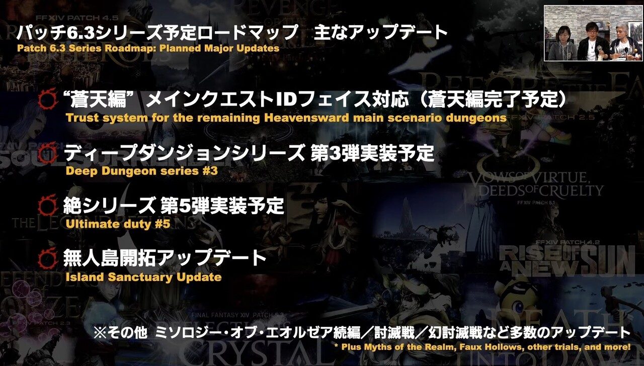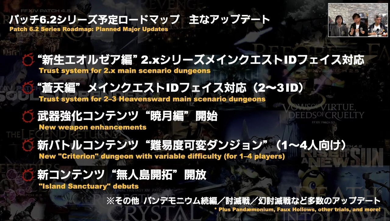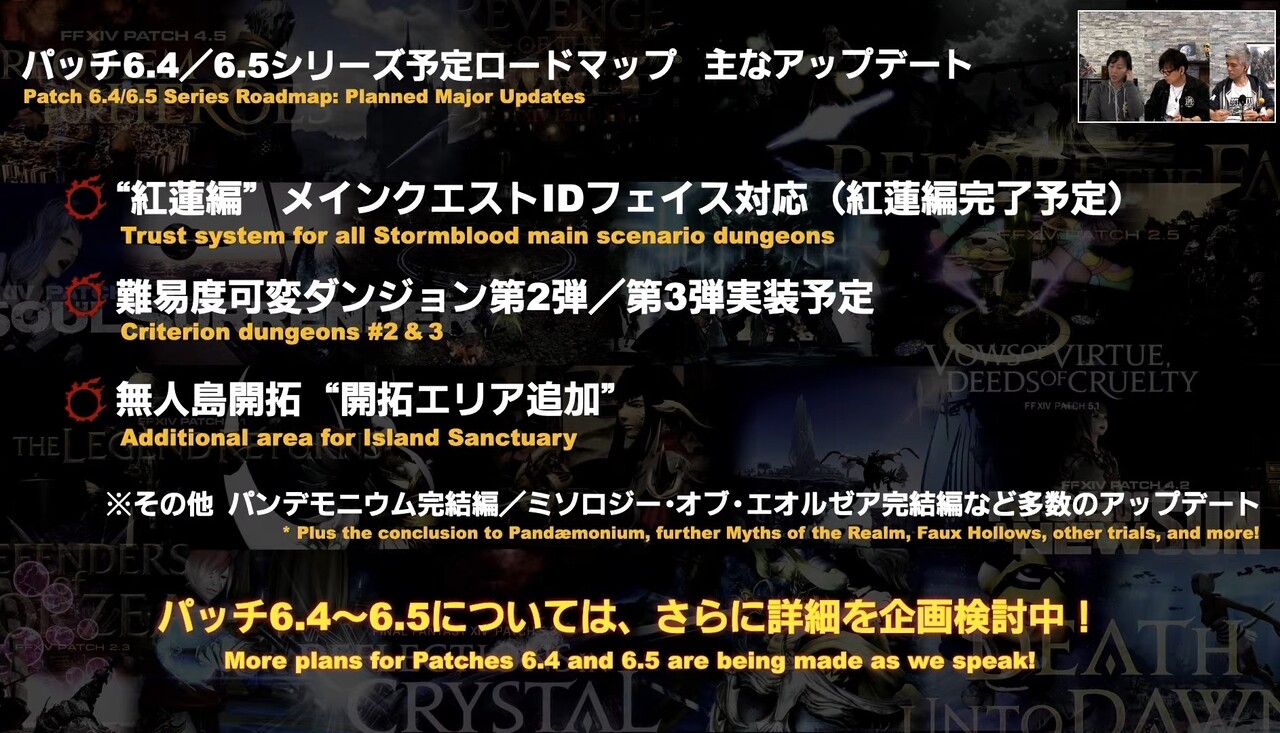 最初のパッチ(6.1)では“新生エオルゼア編”(2.0)のメインクエストIDや4人用討滅戦がフェイスでプレイ可能になるのに加え一部の初期IDや討滅戦はリニューアルするとのことです!
